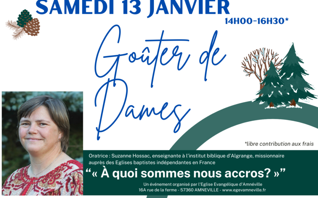 La prochaine édition de ce goûter de dames se prépare pour le samedi 13 janvier 2024. Venez rencontrer d’autres femmes de la région pour passer un temps convivial autour d’un goûter et de discussions sur le thème « A quoi sommes-nous accros? ». L’oratrice Suzanne Hossac partagera une partie de son expérience de vie et de l’enseignement qu’elle apporte aux personnes qui se préparent pour servir l’Eglise.